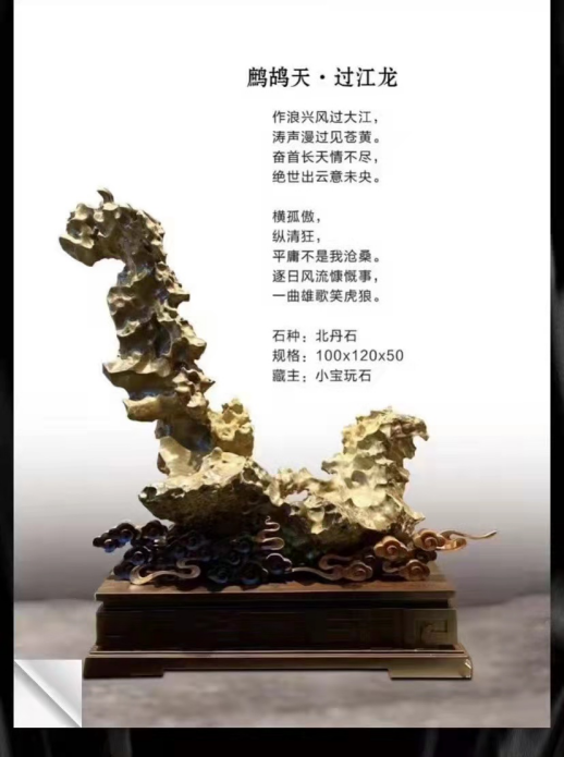 题名;(跃龙门) 石种:广西北丹石 规格:118-36-98CM 收藏:(兄弟石馆) 电话13014899635 记者:您收藏了百来块,重达百吨的北丹石,而且不少都是获了大奖,您怎样看待北丹石,将如何继续讲好北丹石的故事? 齐西零:北丹石全称来宾北丹水冲石,是近几年才发现的新石种,其产于红水河广西来宾忻城县果遂镇北丹村段,并因此而得名。从2018年,我亲眼看到北丹石起水,就被北丹石的造型、质地、纹理深深吸引了,所以现在我更专注于北丹石。北丹石具备了红水河奇石独具的皮色,也有着摩尔石线条之美而且青出于蓝胜于蓝,更具有传统石文化的瘦、漏、皱、透经典魅力所在。