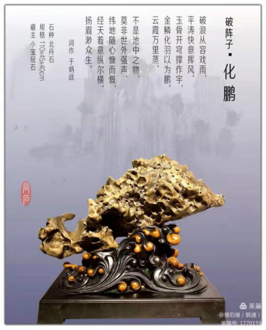 题名;(山海经之龙鸟) 石种;广西北丹石 规格:87-46-128厘米 收藏:(兄弟石馆) 电话;13014899635 记者:今年春晚上的舞蹈《只此青绿》展现了中国传统文化新的高度。作为广西奇石文化的领军人,您是如何提升自我的修养,让奇石文化鉴赏境界获得升华? 齐西零:中国传统文化发展是未来投资的主要趋势,习主席说过一句很经典的话:青山绿水就是金山银山。玩石首先要静心,更需要修心养性。我平时经常翻阅古典书籍,欣赏中国传统字画,听古筝古琴,看中国古典舞蹈,以丰富自己的文化素养,进而促进自己提升玩石境界。 记者:前不久,在北京冬奥会开幕式上,张艺谋用开放的胸怀、简约的表达,诠释了中国与全世界人民,携手走向未来的心愿。未来,您的奇石会不会走出国门,与世界各国进行跨国交流或跨界交流? 齐西零:日本、韩国、台湾、新加坡的一些石友对中华奇石心驰神往,而在欧美等国家的华人中,他们对奇石也情有独钟。在未来,如果全球疫情得到控制,在时机成熟时,我也计划到国外去进行石文化的交流。现阶段的话,主要是做网上奇石展。毕竟,现在云上赏石也非常地方便。 齐西零力扬北丹石文化,以石明志、以物言情,祝福祖国盛世龙腾,把个人奇石梦与家国梦交融贯通,在新时代书写奇石收藏的新篇章!(林爵栋 李绍权) |